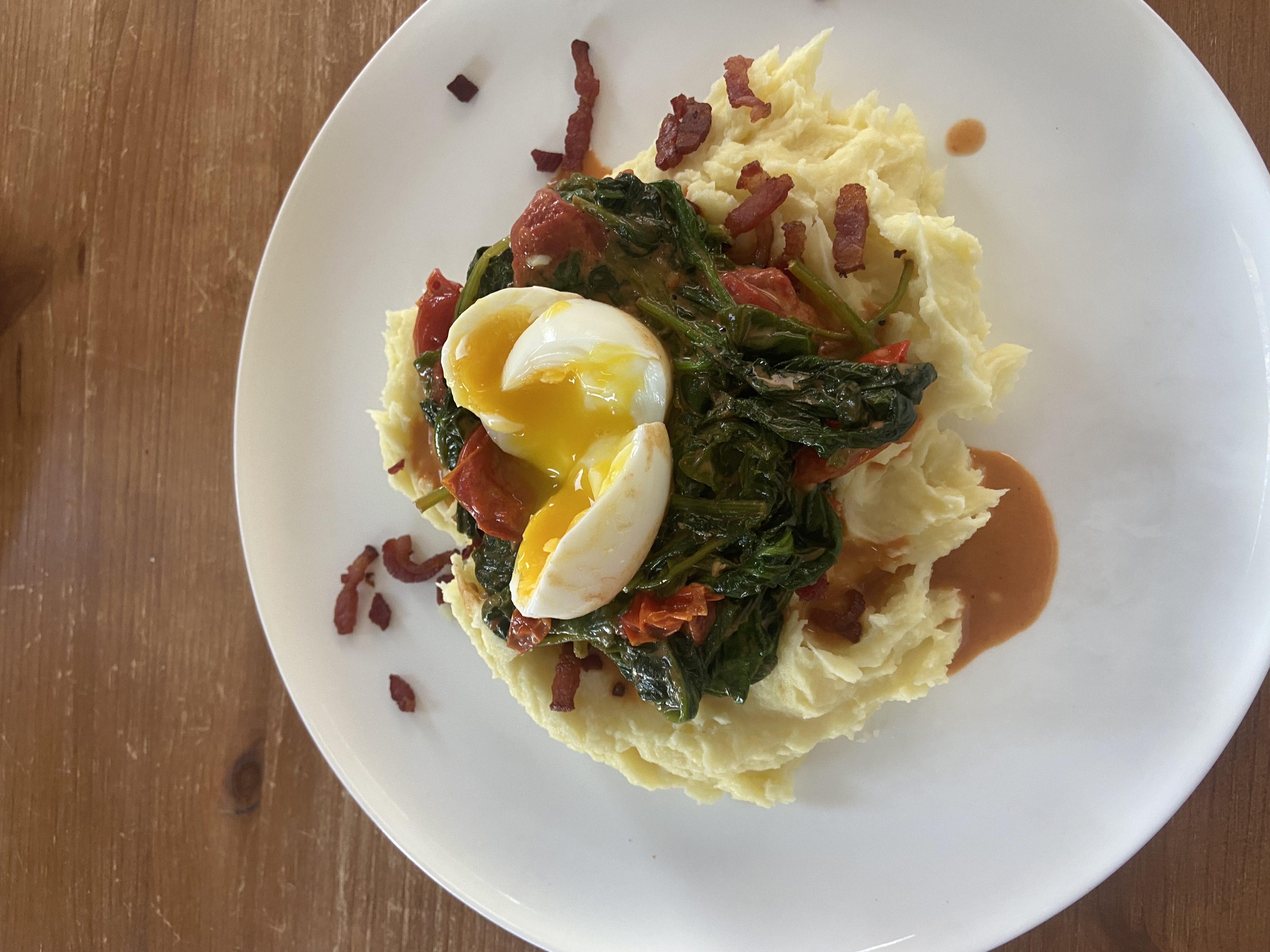 Aardappelpuree met Spinazie, Cherrytomaten en Krokante Spekjes
