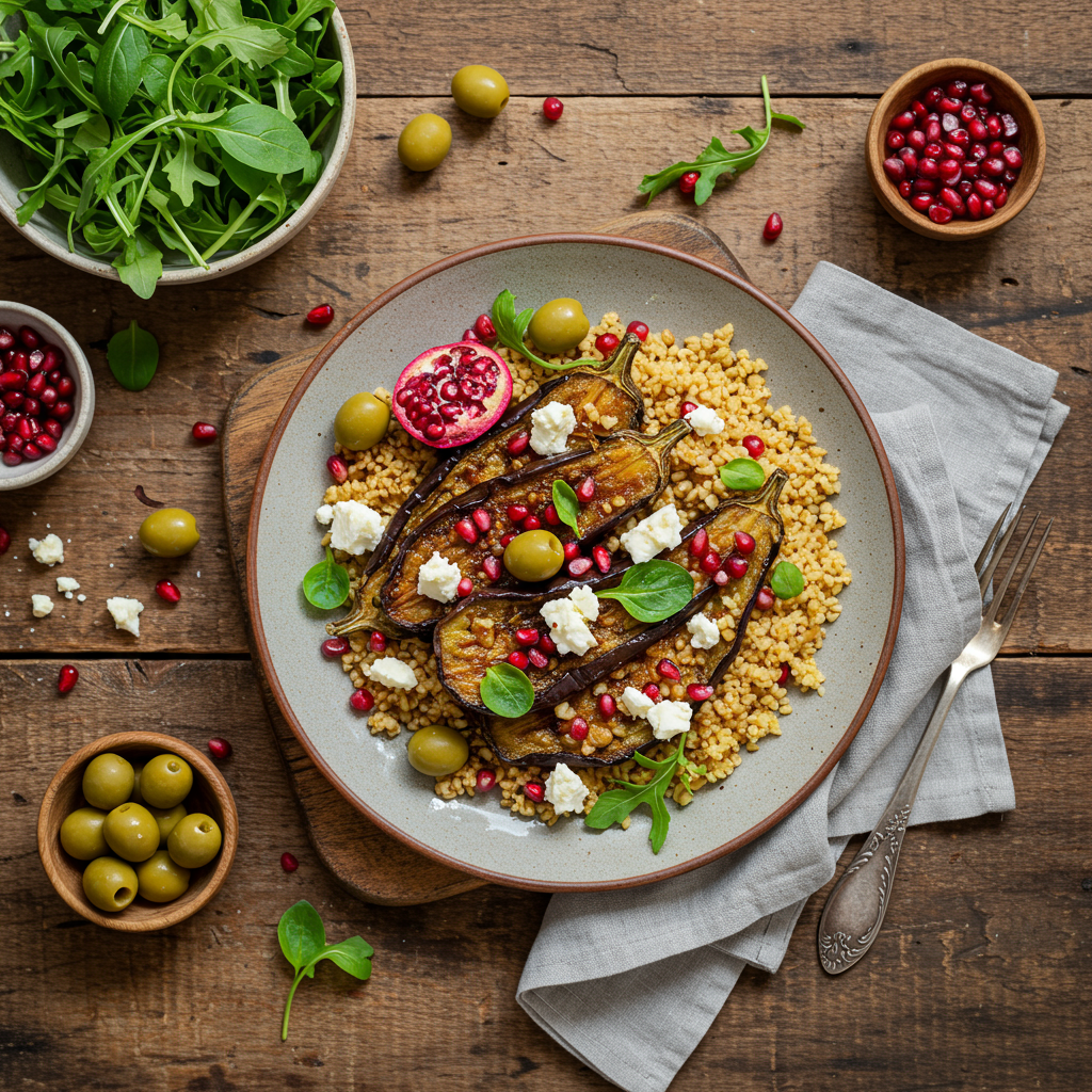 Aubergines in kaneel met feta, olijven & bulgur