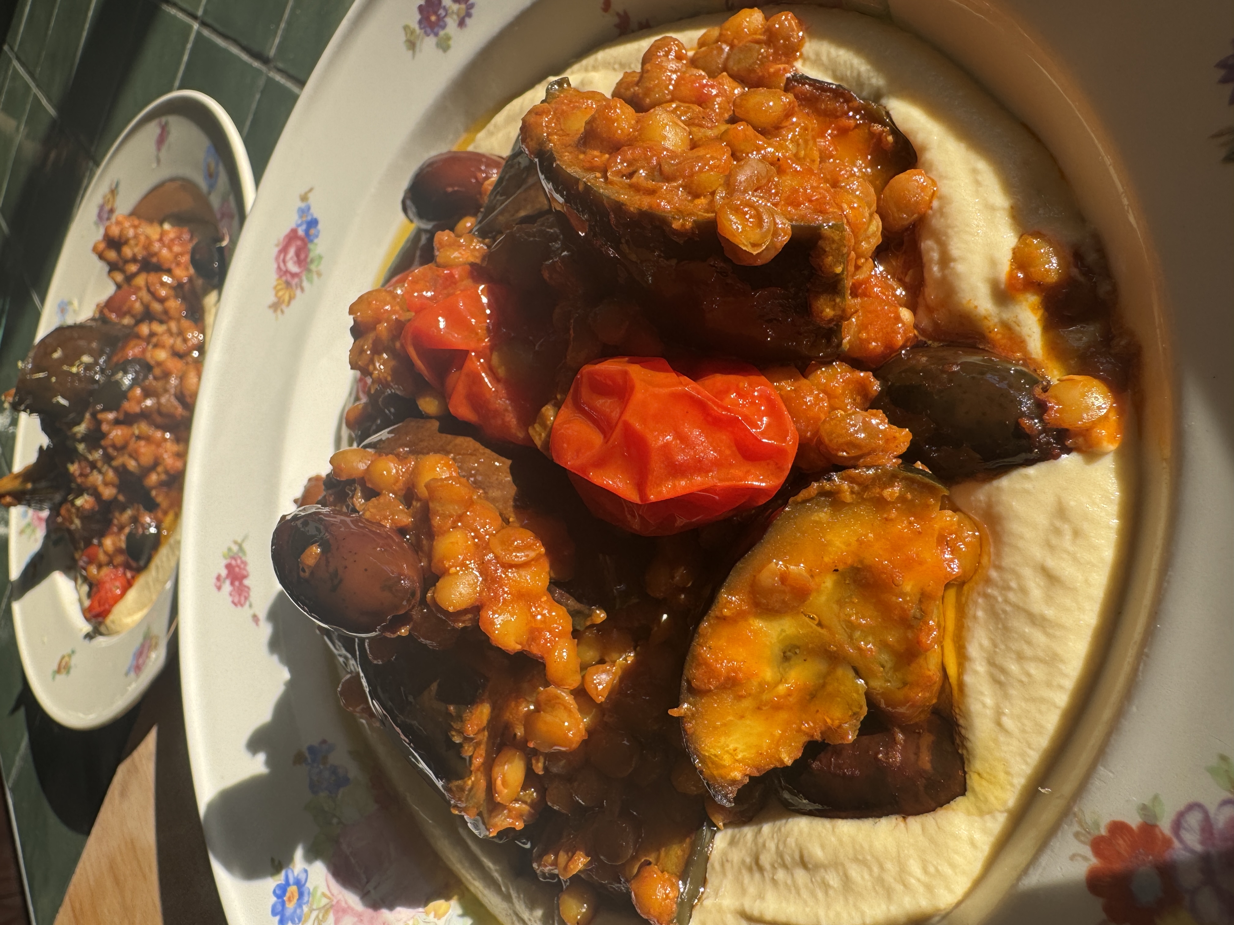 Creamy Hummus met Gegrilde Aubergine, Linzen en Tomaat