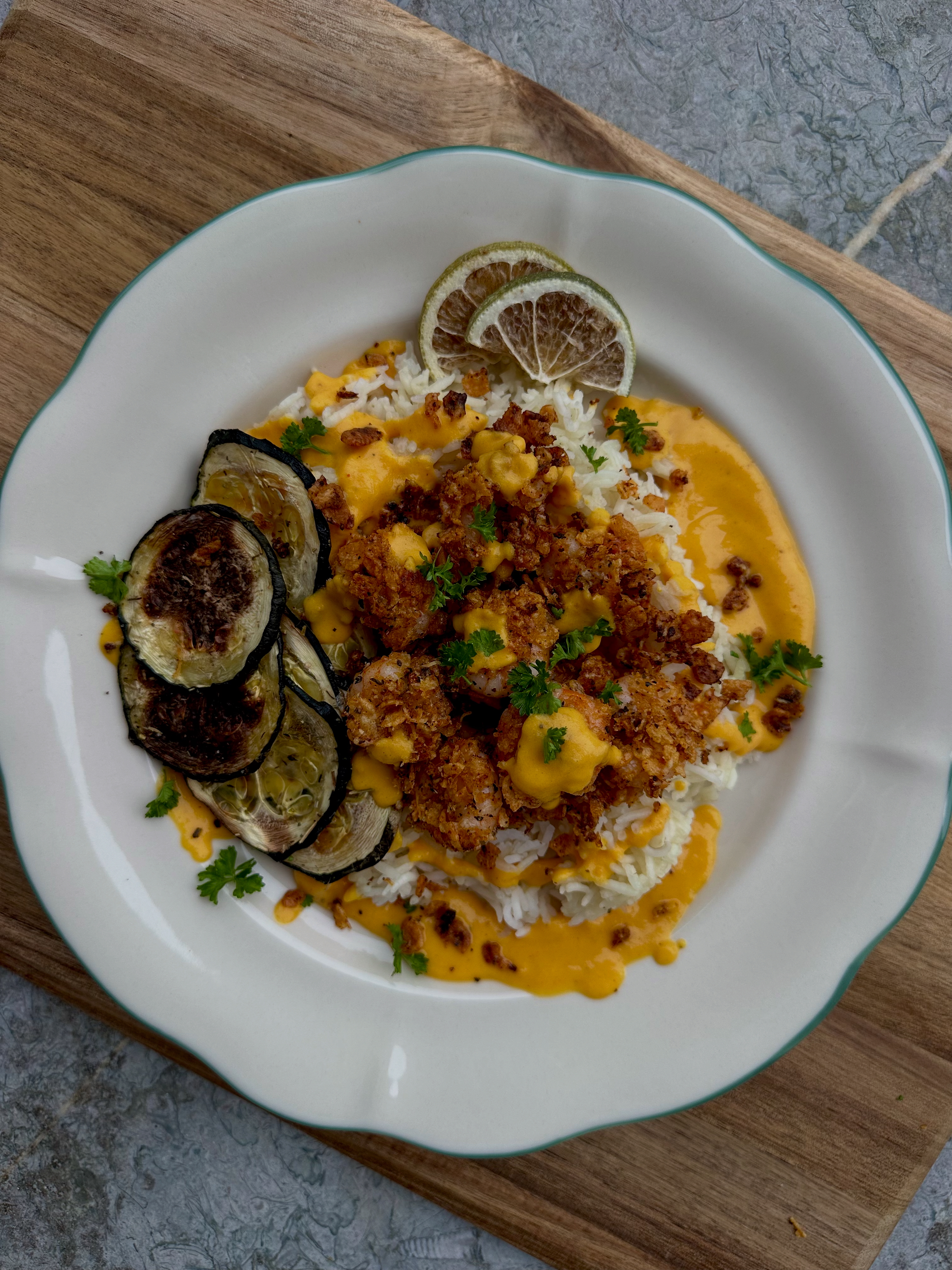 Crispy garnalen met citroen-parmezaankorst en wortel-kerrie dip