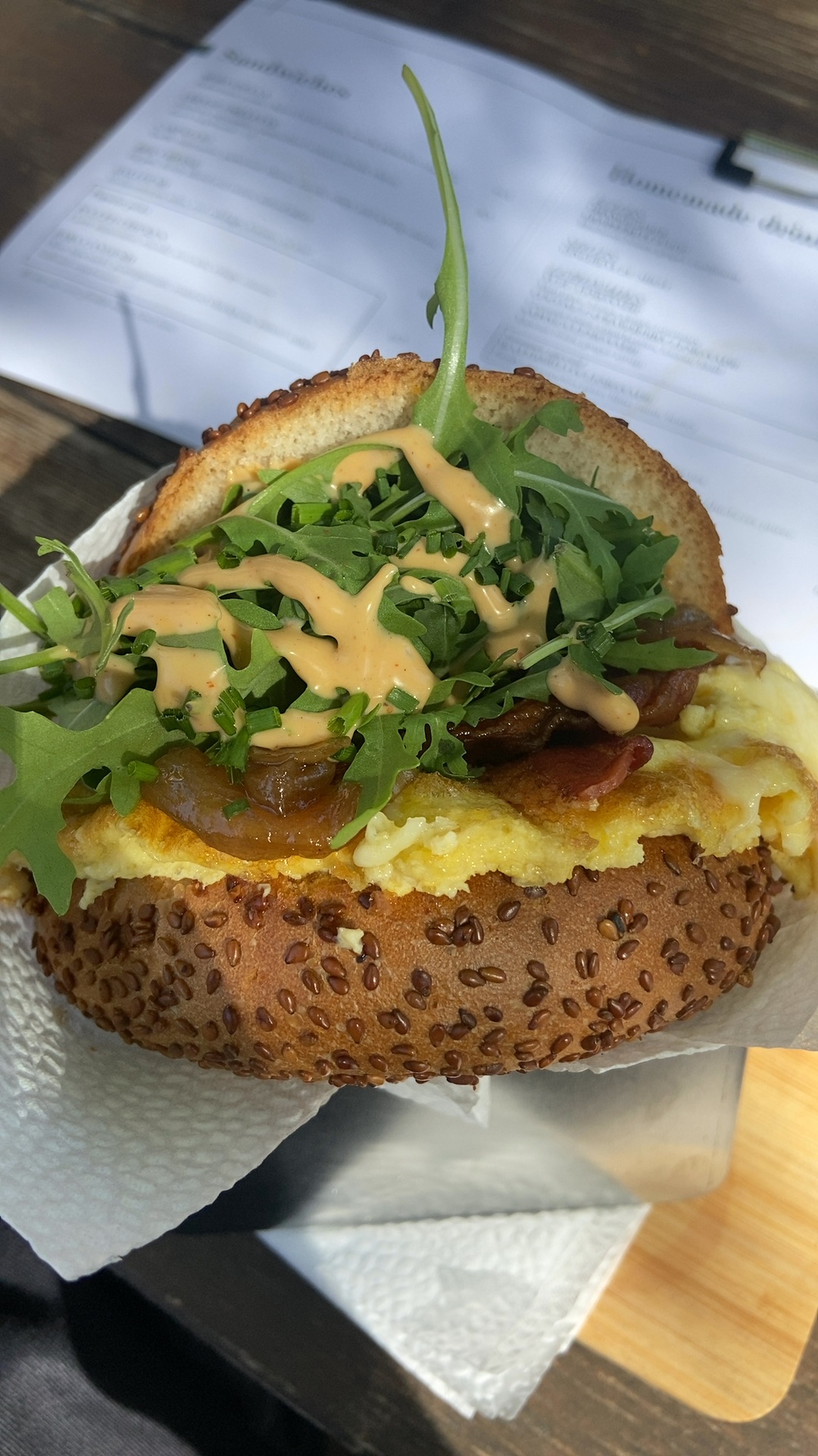 Kaasomelet Sandwich met Bacon, Gekaramelliseerde Ui, Rucola en Sriracha Mayonaise