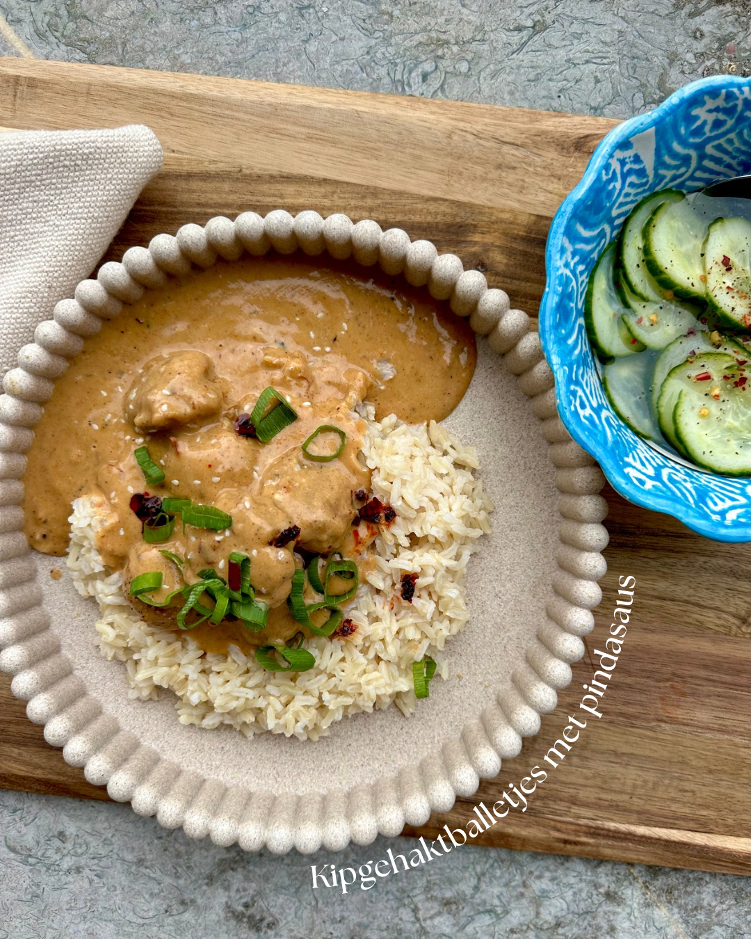 Kipgehaktballetjes met pindasaus en ingelegde komkommer
