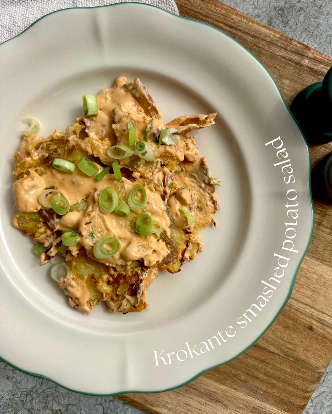 Krokante smashed potato salade met tahin en limoen