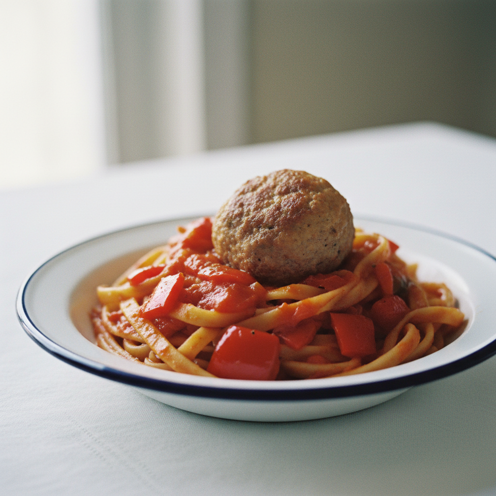 - 10Servez les pâtes dans des assiettes creuses, déposez une boulette de porc farcie dessus et terminez avec les légumes rôtis mis de côté.