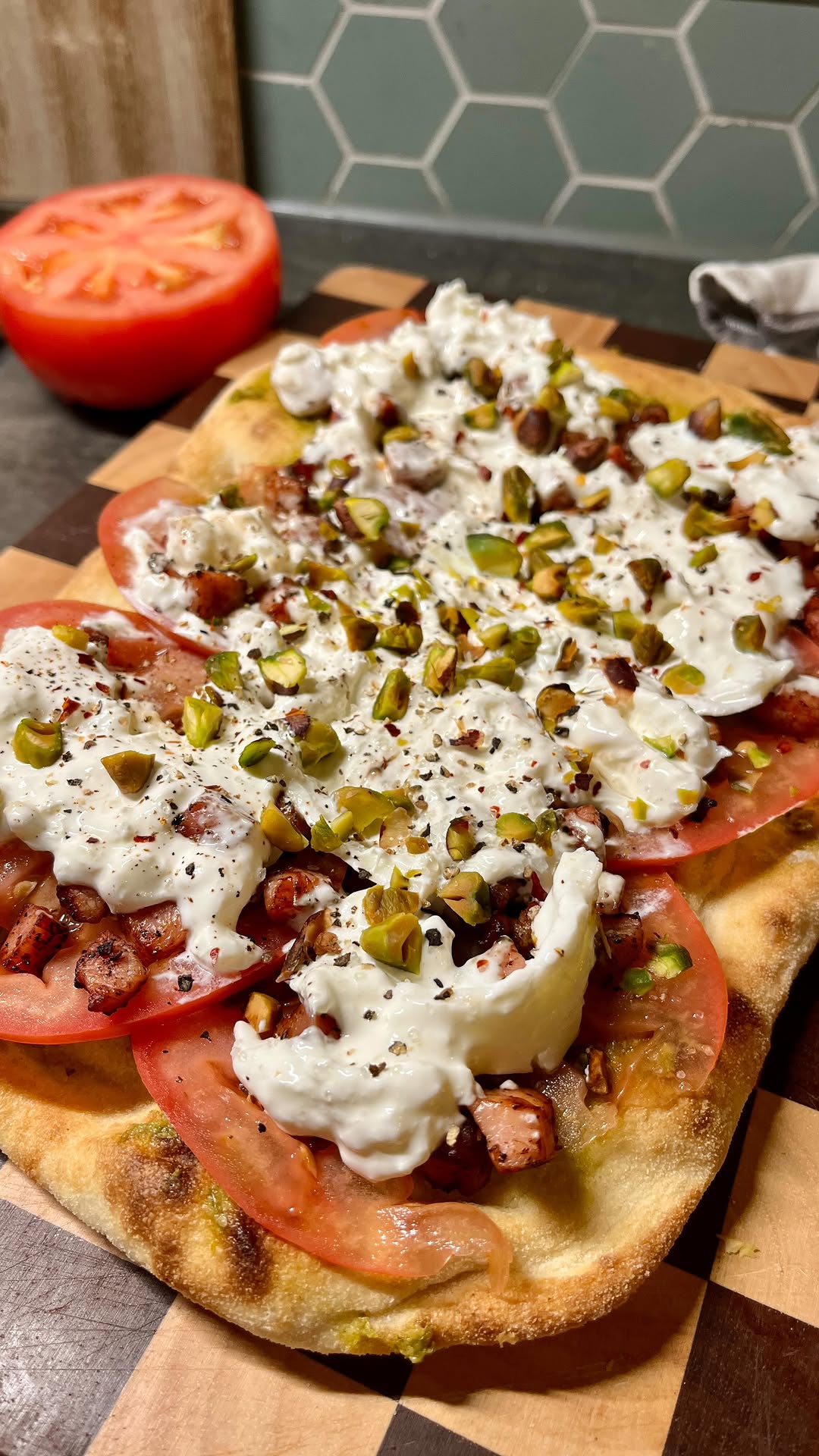 Pinsa met burrata, spekjes en pistachenoten
