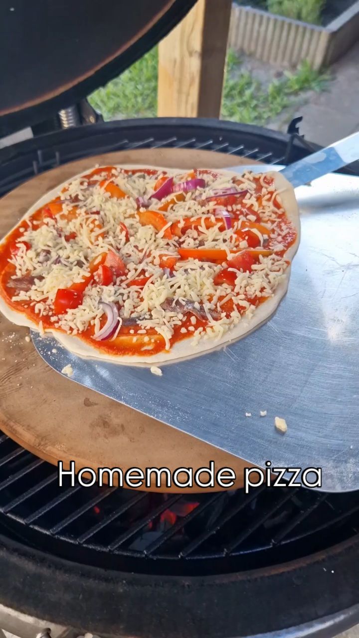 Pizza met tomatensaus, salami, ansjovis, paprika, cherry tomaten, rode ui en kaas