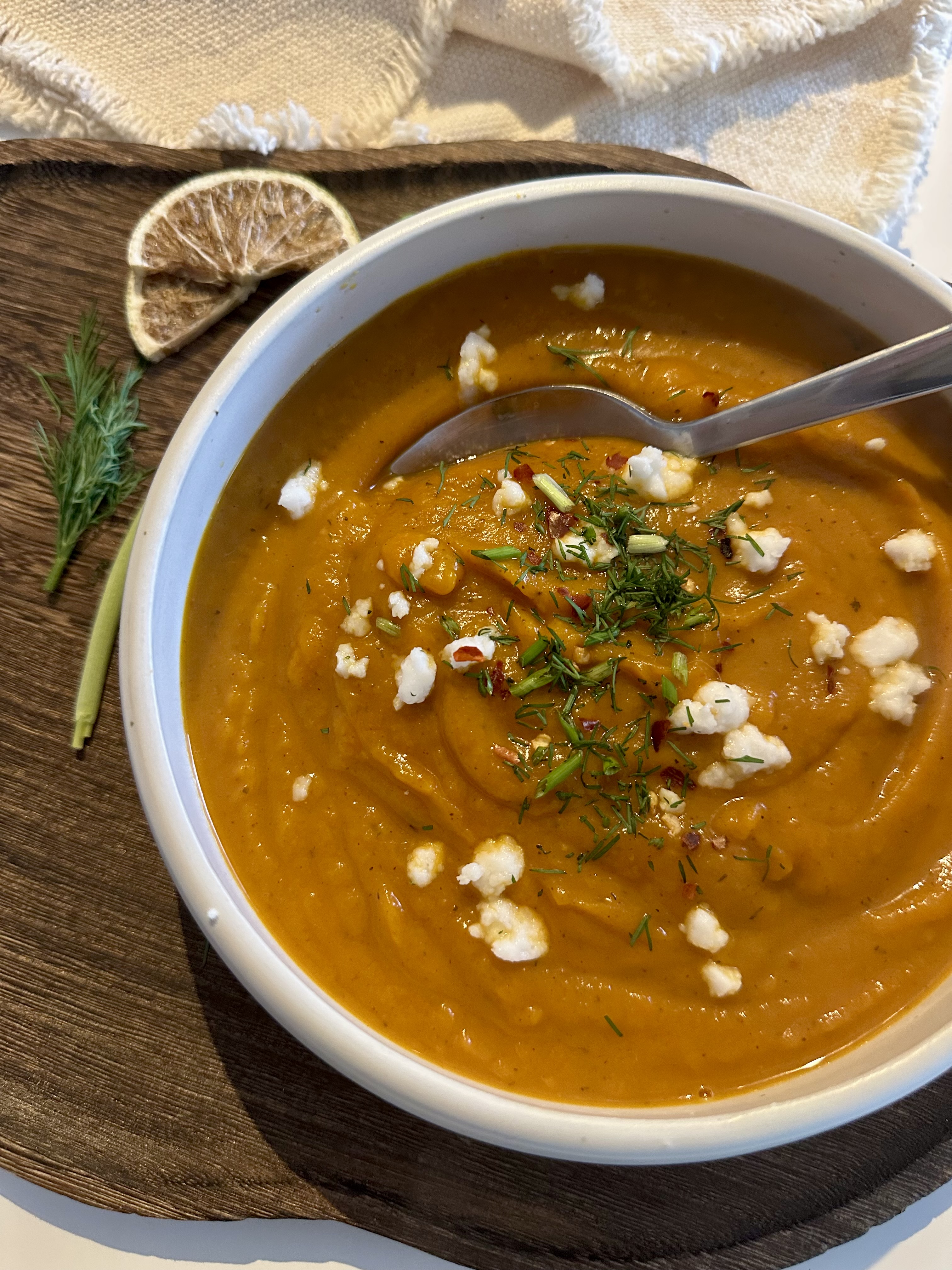 Romige pompoensoep met wortel, paprika & verse kruiden