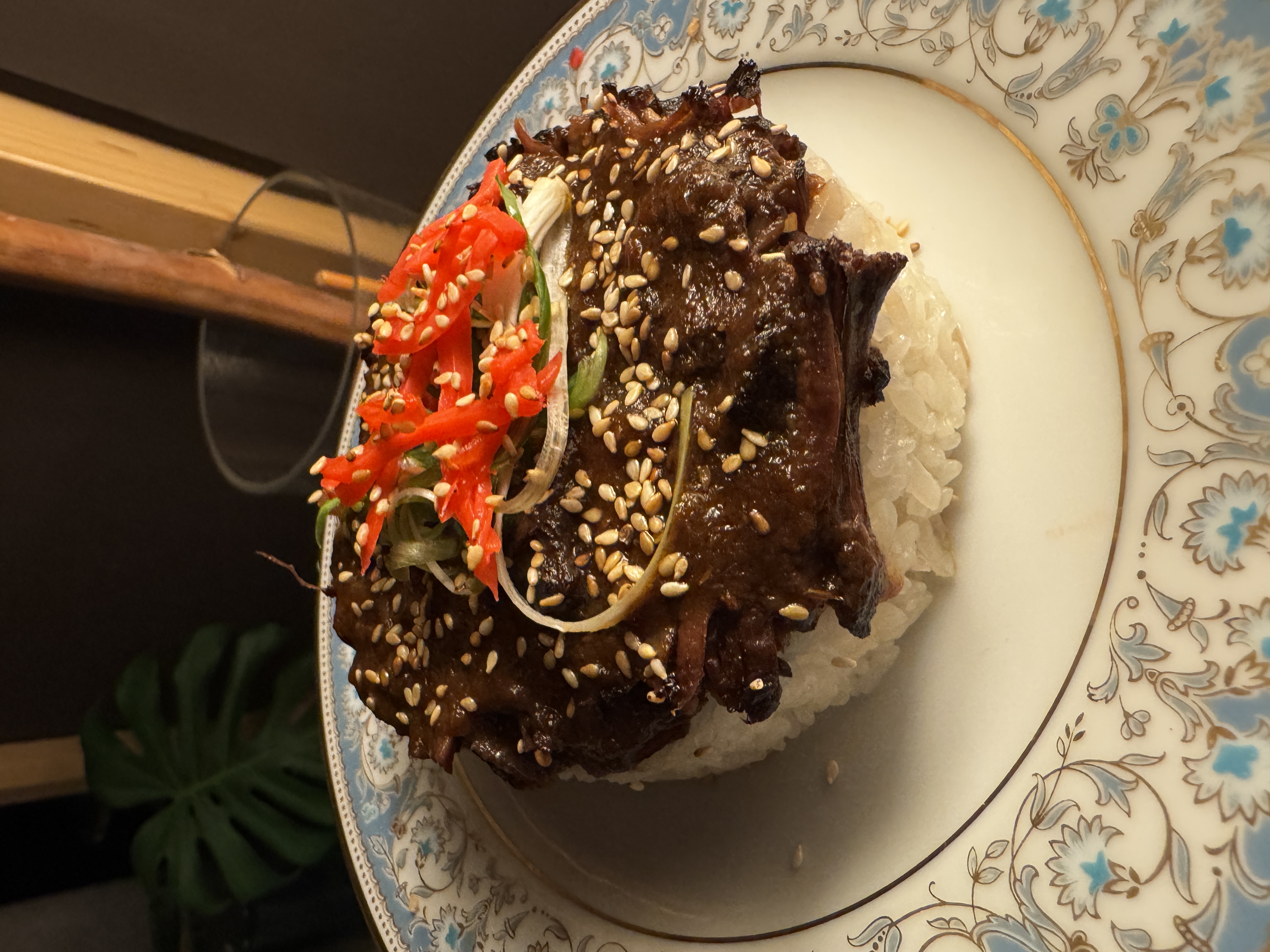 Stoof van ossestaart en short ribs op sushi rijst met sesam, bosui en ingelegde gember