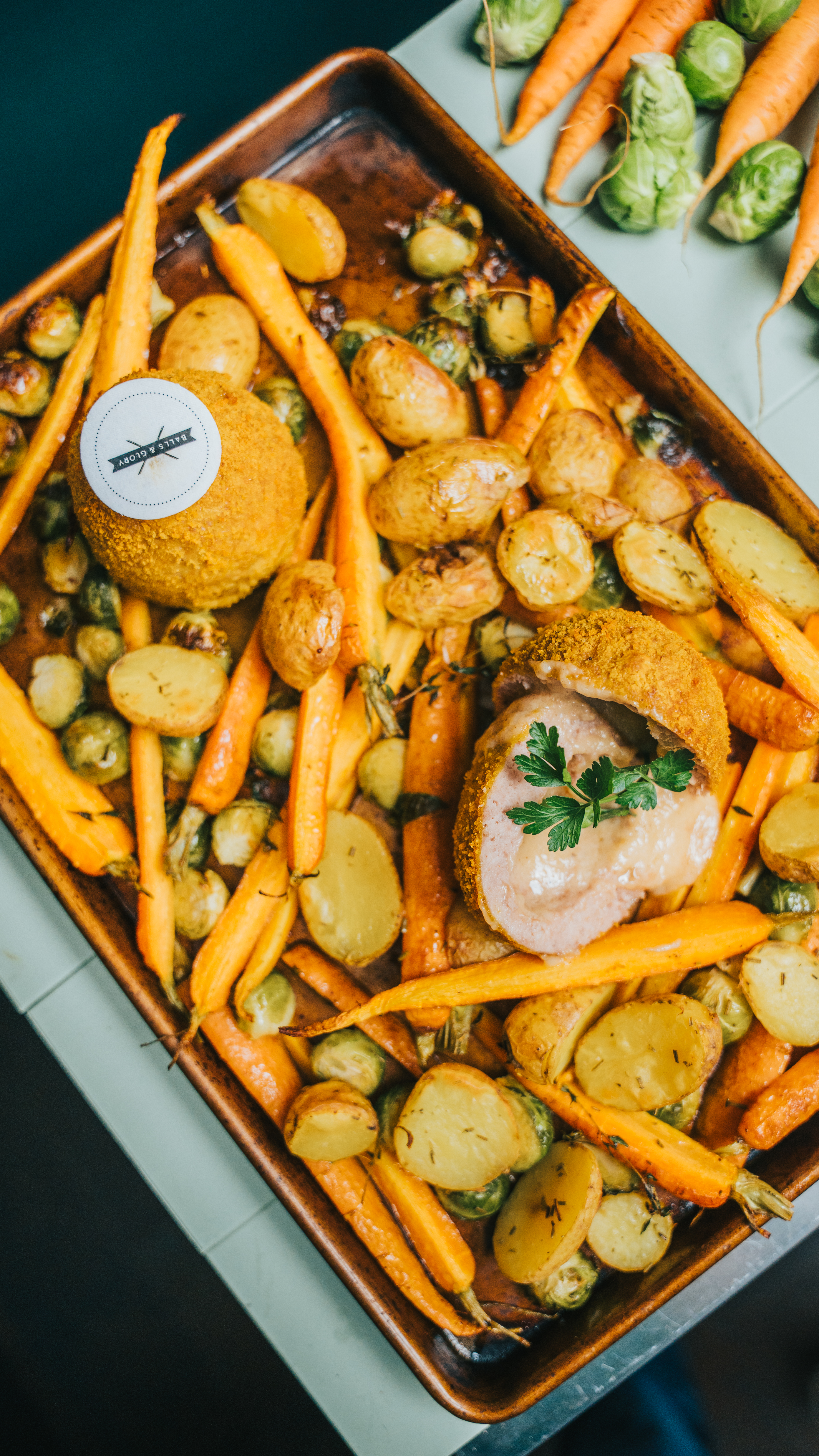 Traybake van groenten met gevulde Balls & Glory gehaktbal
